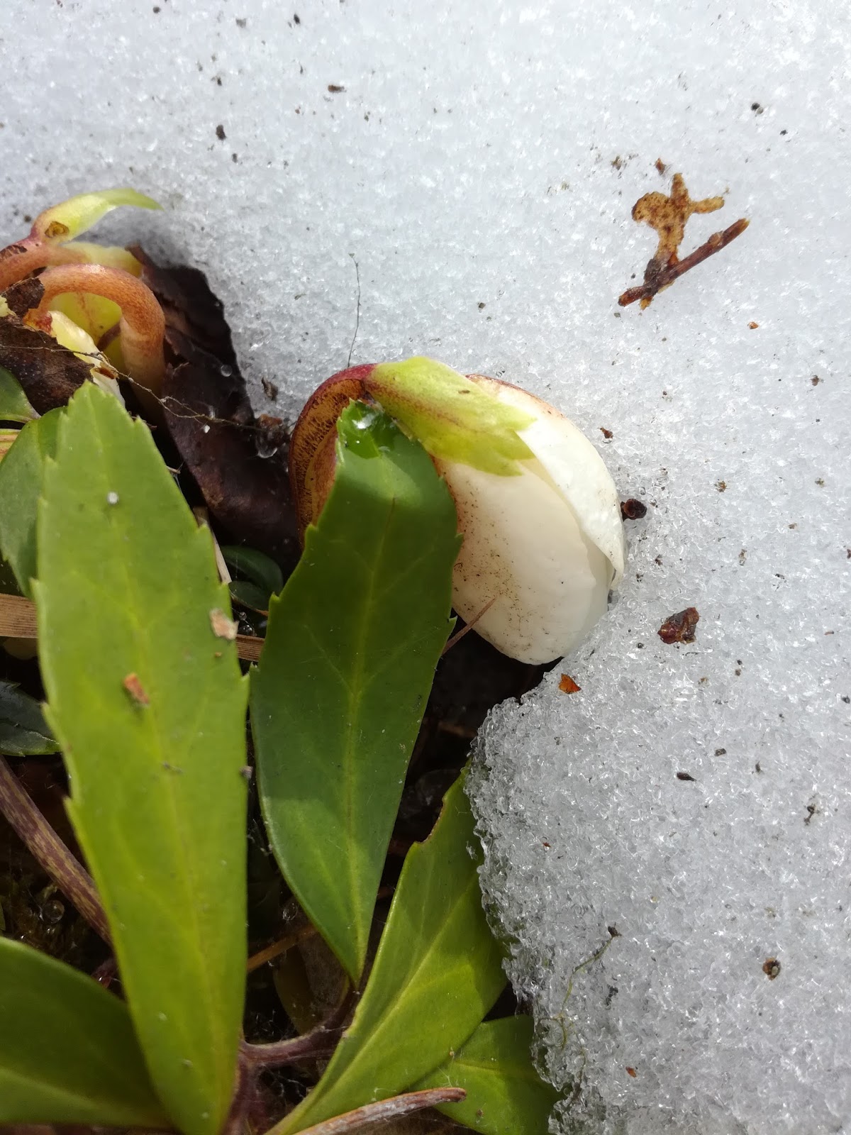 Aikaisimmat valkoiset krookukset ovat poranneet tiensä lumilaikkujen läpi. Vaaleajouluruusunkin nuput paljastuivat, vaikka sillä oli naama vielä hieman lumessa. Kurkkasin varovasti vaaleanpunaisen kerratun tarhajouluruusun talvisuojan alle ja siellä näkyi muutama muhkea nuppu.